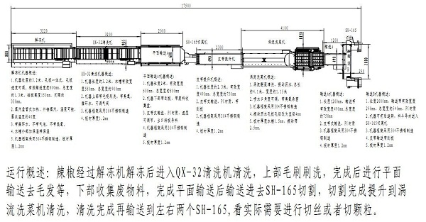 其定制生產(chǎn)線是(辣椒解凍機(jī)--氣泡清洗--平面輸送--切割--皮帶提升--渦流洗菜機(jī)清洗--平面輸送--切割)。