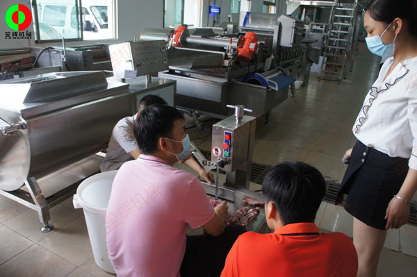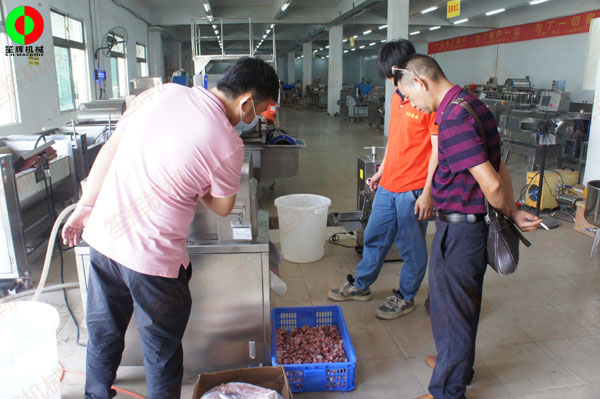 佛山某肉食品加工配送中心客戶一行人親臨我司測試訂購洗排骨機等設(shè)備!
