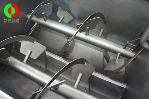 1、采用平行雙軸結(jié)構(gòu),攪拌軸上裝有斜板式槳葉及螺旋推進(jìn)攪拌圈,物料在料斗中翻動的同時作旋轉(zhuǎn)運(yùn)動,使各種物料攪拌的更加均 勻,使之達(dá)到較佳混料效果;